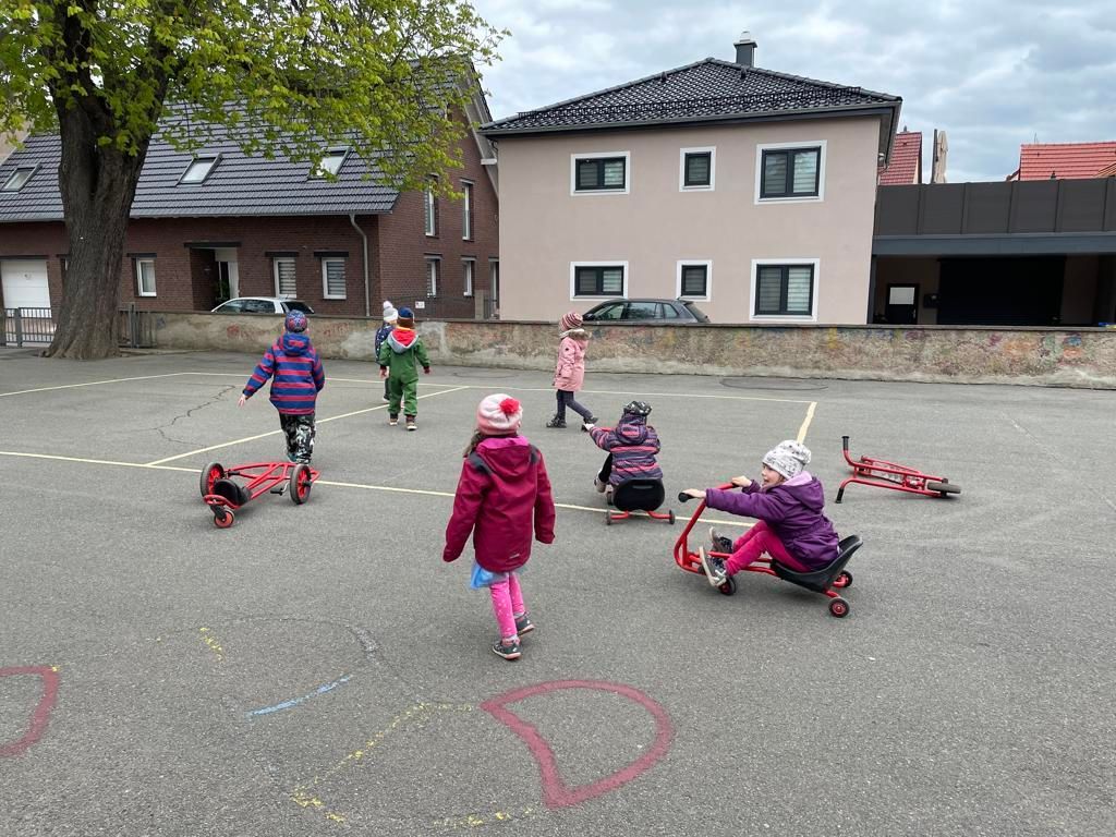 Natürlich durfte auch das gemeinsame Spielen mit den Schulkindern nicht fehlen. Auf dem Bauteppich und dem Schulhof wurde das Spielzeug und vor allem die großen Fahrzeuge ausgiebig getestet.